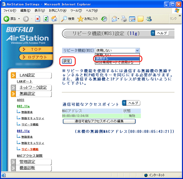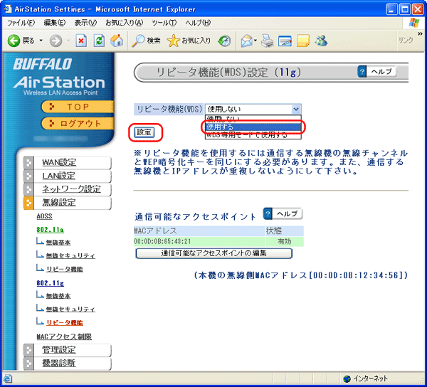 「リピータ機能(WDS)」欄で「使用する」を選択して、[設定]をクリックします。