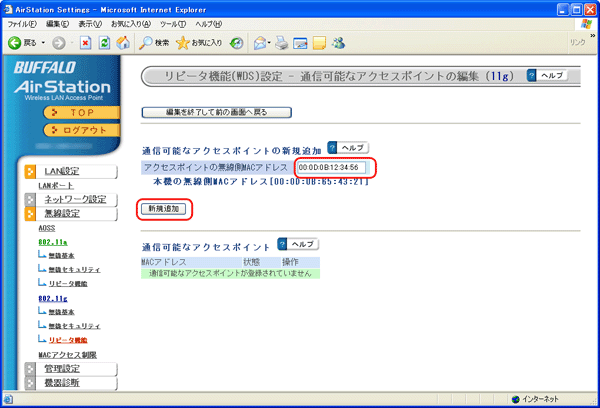 「アクセスポイントの無線側MACアドレス」欄に1台目のAirStationの無線側のMACアドレスを入力し、[新規追加]をクリックします。
