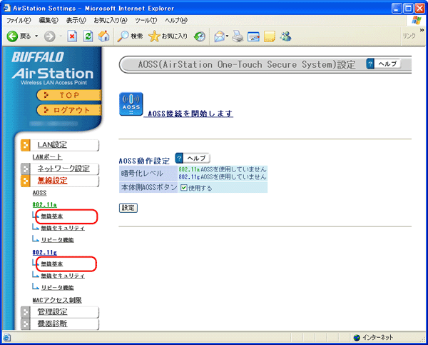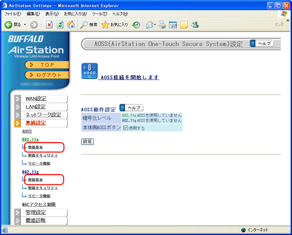 ・ AirStationのAOSS機能とリピータ機能は同時に使用できません。リピータ機能の設定をする場合は、AOSS機能を無効にする必要があります。