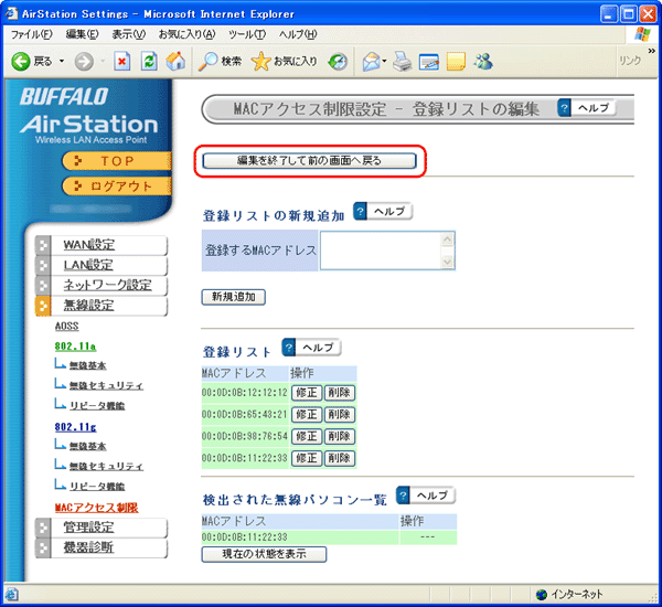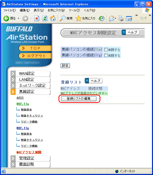 6. MACアドレスの登録画面を表示します。 [登録リストの編集]をクリックします。![]()