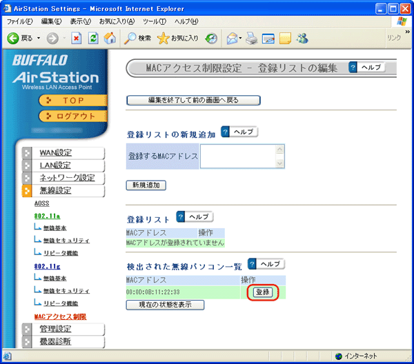 7. 無線で接続できるパソコンと、接続できないパソコンを指定します。 [検出された無線パソコン一覧]には、現在接続されている無線パソコンのMACアドレスが表示されています。ここで、接続可能にするパソコンのMACアドレスのみを[登録]をクリックして登録します。無線パソコンのMACアドレスは、「無線アダプタのMACアドレスを確認したい」を参照してください。