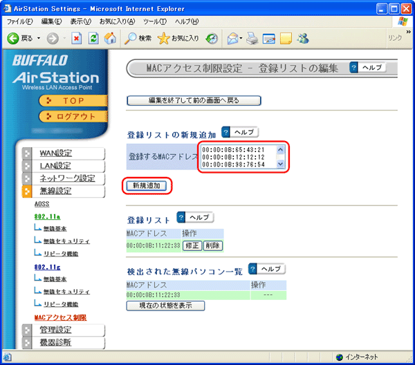 [検出された無線パソコン一覧]に表示されていないパソコンを接続可能にする場合は、[登録するMACアドレス]に接続するパソコンのMACアドレスを入力し、[新規追加]をクリックします。MACアドレスを入力するときは、2桁ずつコロン(:)で区切って入力します。登録できるMACアドレスは64個までです。![]()