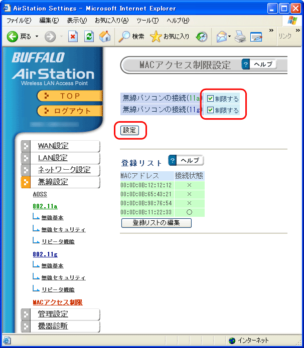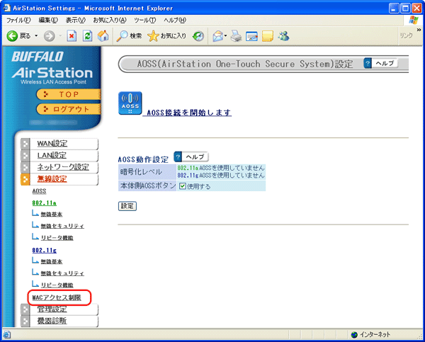 ・ AirStationのAOSS機能とMACアクセス制限は同時に使用できません。MACアクセス制限を使用する場合は、AOSS機能を無効にする必要があります。