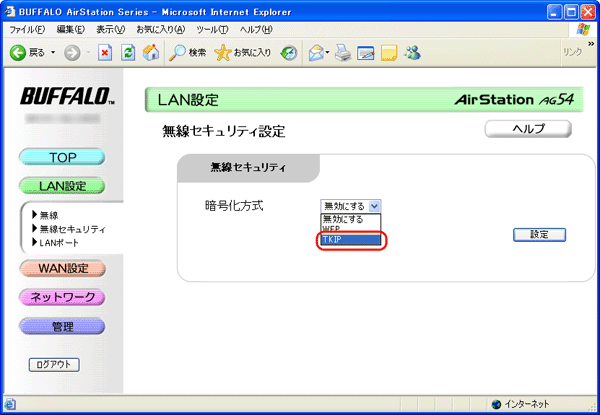 4. 暗号化方式を選択します。 [TKIP]を選択します。