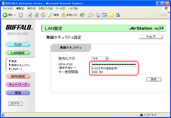 6. 暗号化の設定を登録します。 手順5の画面で[設定]をクリックします。 7. 無線パソコンからAirStationに再接続します。 暗号設定した場合は、必ず無線接続するパソコン側へも上記で設定した事前共有キーを設定してください。事前共有キーを入力しないと、AirStationと通信できません。