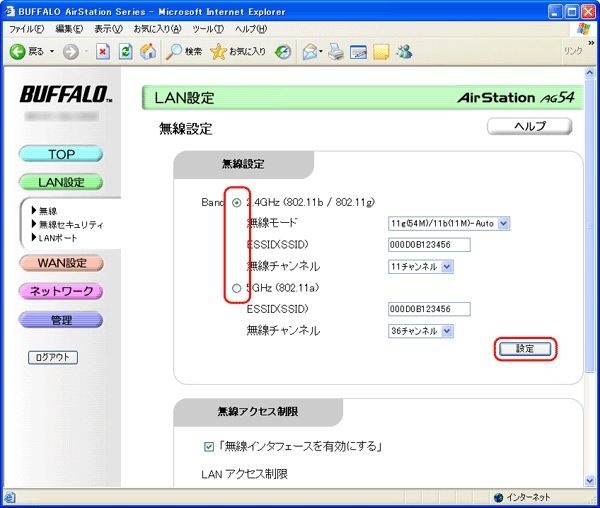 3. 無線方式を設定します。 使用する無線方式(5GHz(802.11a)または2.4GHz(802.11b/802.11g))をクリックし、無線チャンネルを選択して[設定]をクリックします。 ・ 5GHzを使用する場合は、隣接するAirStationと異なるチャンネルを設定してください。 ・ 2.4GHzを使用する場合は、隣接するAirStationと干渉しないよう、4チャンネル以上間隔をあけて設定してください。