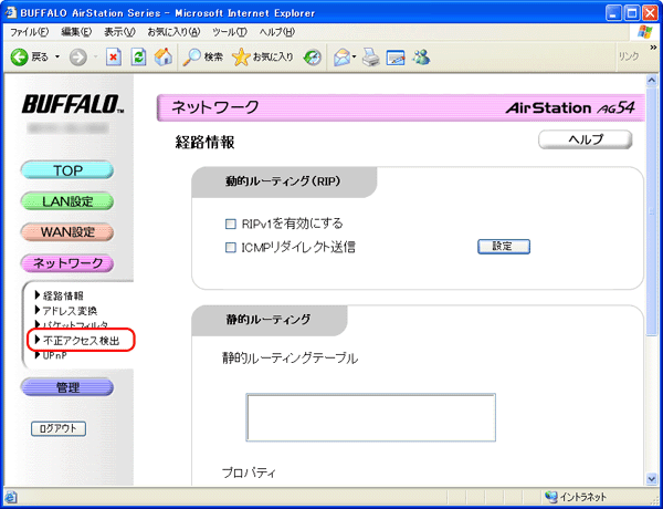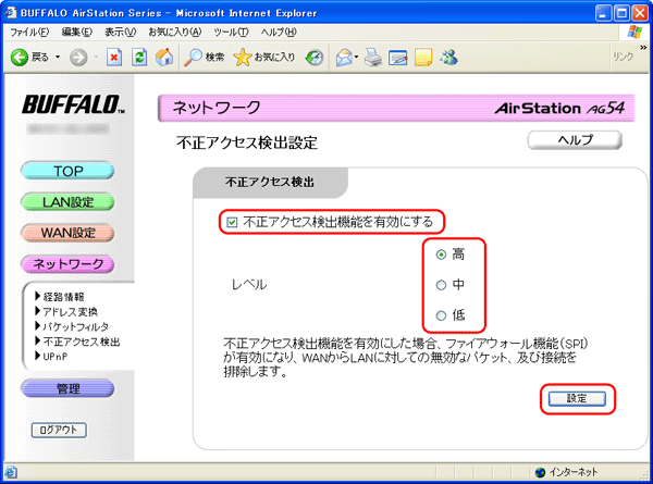 「不正アクセス検出」機能で不正アクセスからパソコンを防御する AirStationに搭載している「不正アクセス検出」機能で、インターネットを使った他者からの不正アクセスを防御することができます。 ここでは例として、不正アクセスを防御した結果をログに記録させる手順を説明します。 1. AirStationの設定画面を表示します。 設定画面を表示する 2. ネットワーク設定画面を表示します。 画面左の[ネットワーク]をクリックします。 3. 不正アクセス検出設定画面表示します。 画面左の[不正アクセス検出]をクリックします。 4. 不正アクセス検出の設定をします。 「不正アクセス検出機能を有効にする」をクリックしてチェックマークをつけ、 レベルを設定します。 レベルは、「高」、「中」、「低」の3つから選択でき、「高」のほうがより細かな監視を行いますが、 AirStationのスループットも低下します。 レベルを選択したら、[設定]をクリックします。 不正アクセスの検出結果は、AirStationの設定画面から[管理]-[ログ情報]の画面で、「不正アクセス検出」欄の横の[ログの参照]をクリックすることで確認できます。