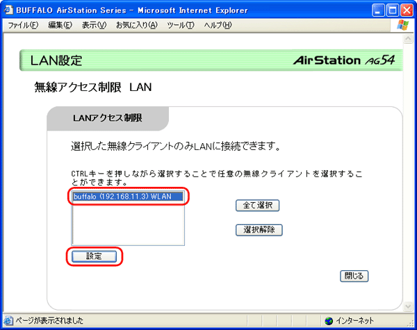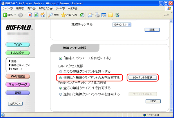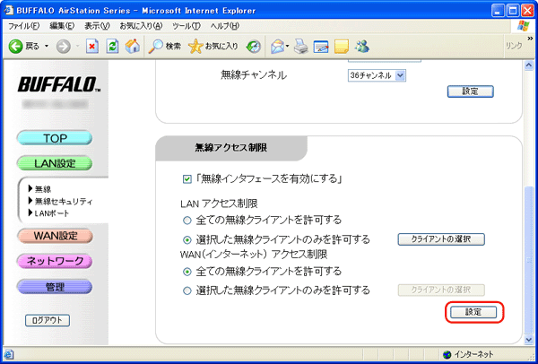 LAN上の他のパソコンへのアクセスを制限する 特定の無線パソコンだけが同じLAN上のパソコンと通信できるようにするには、以下の設定を行います。 LAN上の有線パソコンへのアクセスのみ制限できます。無線パソコンへのアクセスは制限できません。 1. AirStationの設定画面を表示します。 設定画面を表示する 2. 無線設定画面を表示します。 画面左の[LAN設定]をクリックします。 3. 接続を許可する無線パソコンを登録します。 LANアクセス制限の「選択した無線クライアントのみを許可する」を選択し、[クライアントの選択]をクリックします。 現在、AirStationに接続している無線パソコンが表示されるので、接続を許可する無線パソコンを選択し、[設定]をクリックします。 [閉じる]をクリックします。 4. 無線によるアクセスを制限します。 [設定]をクリックします。 以上で設定は終了です。 「セキュリティを強化したい 」へ戻る