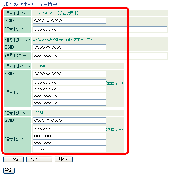 AOSSの場合は、暗号化レベル、SSID、暗号化キー(事前共有キー)が表示されます。