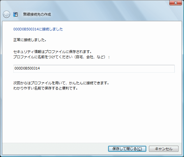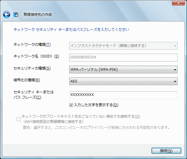 ※無線親機に暗号キーが設定されている場合は、「セキュリティの種類」「暗号化の種類」を選択し、「セキュリティキーまたはパスフレーズ」に「暗号キー」を入力して、[接続]をクリックします。