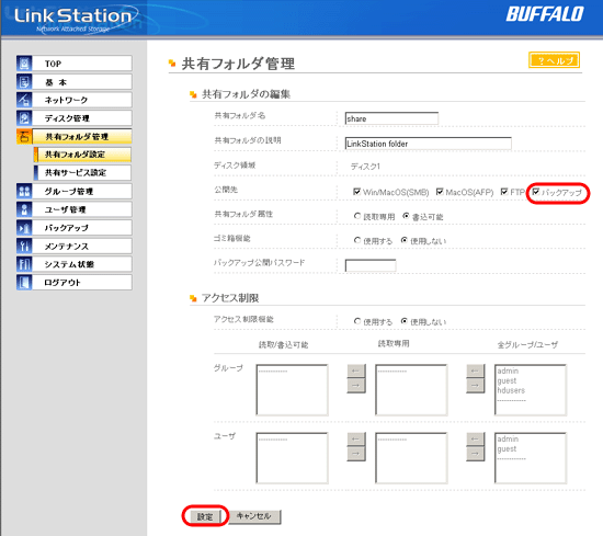バックアップ先Link/TeraStation共有フォルダに設定したバックアップ公開用パスワードを入力し、[設定]をクリックします。