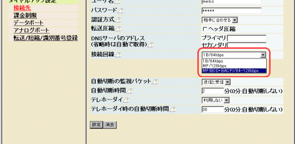 4. MP接続の通信方法を設定します。 [接続回線]欄を選択します。1B/64kbps: