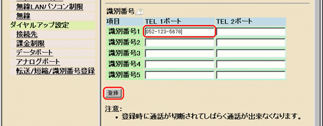 [識別番号]に電話番号を入力します。 下の画面は、電話番号「052-123-5678」からTEL1ポートにかかってきたときのみ、着信する場合の設定です。 |