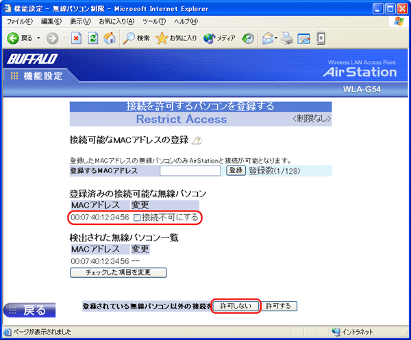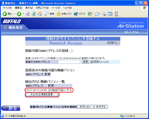 4. 無線で接続できるパソコンと、接続できないパソコンを指定します。 [検出された無線パソコン一覧]には、現在接続されている無線パソコンのMACアドレスが表示されています。ここで、接続可能にするパソコンのMACアドレスを確認して[接続可能にする]にチェックマークを付けます。接続不可にするパソコンは、チェックマークを外したままにしておきます。
