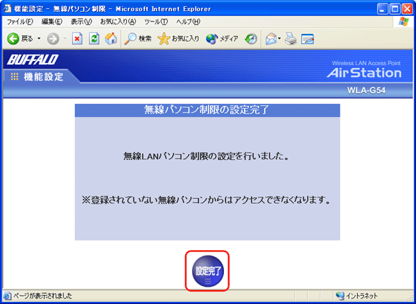 無線パソコンからのAirStationへの接続を制限します。この設定を行うと、登録した無線パソコンだけが、AirStationを経由してインターネットに接続したり、有線(ケーブル)接続したパソコンと通信したりすることができます。