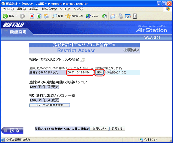 「検出された無線パソコン一覧」に表示されていないパソコンを接続可能にする場合は、「登録するMACアドレス」に接続するパソコンのMACアドレスを入力し、[登録]をクリックします。MACアドレスを入力するときは、2桁ずつコロン(:)で区切って入力します。登録できるMACアドレスは128個までです。