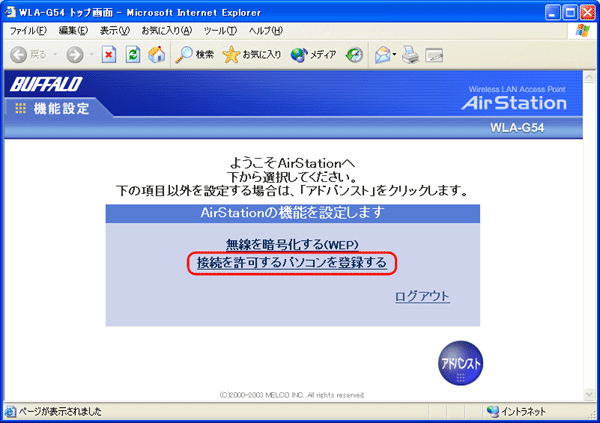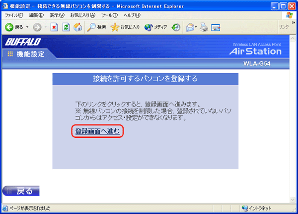 1. AirStationの設定画面を表示します。 2. 「接続を許可するパソコンを登録する」画面を表示します。 [接続を許可するパソコンを登録する]をクリックします。