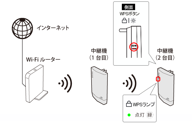 3. 1台目の中継機のWPSボタンを、WPSランプが2回ずつ点滅するまで(約2秒間)押し続けます。