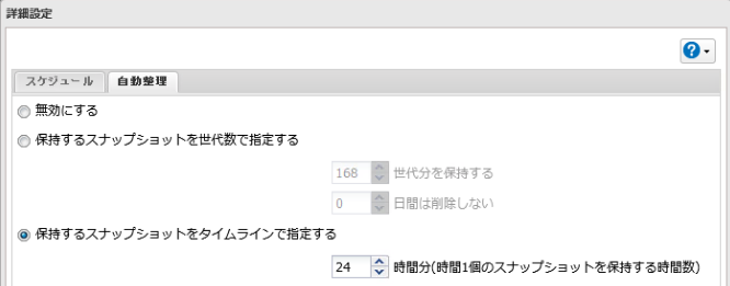 「保持するスナップショットをタイムラインで指定する」を「24」時間分保存する設定をしています。