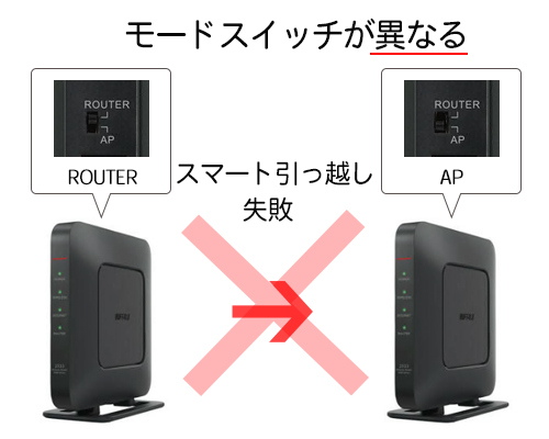 同じシリーズのWi-Fiルーターでスマート引っ越しする際に、引っ越し元と引っ越し先の「AUTO/MANUAL」スイッチ、「ROUTER/AP/WB(モードスイッチ)」スイッチの設定が異なる場合に失敗します。
