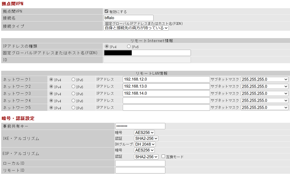 拠点間VPN接続先のVLANすべてにアクセスするには、リモートLAN情報に接続先VLANのネットワークアドレスをすべて記載する必要があります。