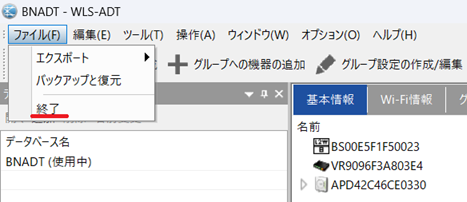 1. [ファイル]メニューの[終了]を押し、WLS-ADTを終了します。