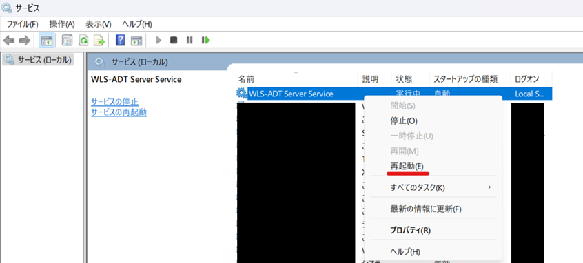 3. Windowsサービス画面内の「WLS-ADT Server Service」を右クリックし、 「再起動」を選択することで、WLS-ADTサービスの再起動を行います。