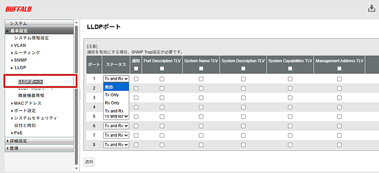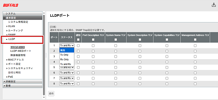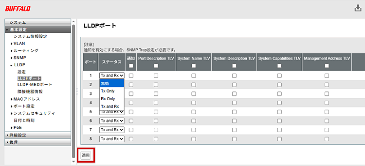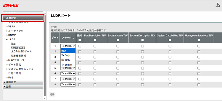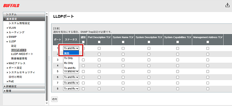 5. [LLDPポート]画面で、他社製Wi-Fiアクセスポイントと接続されているポートのステータスを「無効」に選択します。