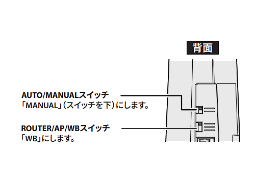 1. エージェント(WSR6500BE6P)背面のAUTO/MANUALスイッチを 「MANUAL」、ROUTER/AP/WBスイッチを 「WB」に設定します。