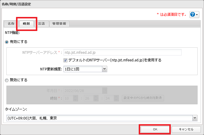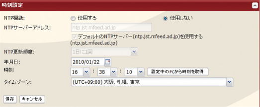 NTP機能を使用しないときは、「無効にする」を選択し日時を入力します。[設定中のPCから時刻を取得]をクリックすると、入力欄に設定画面にアクセスしているPCの日時が入力されます。