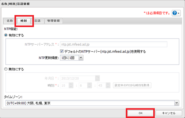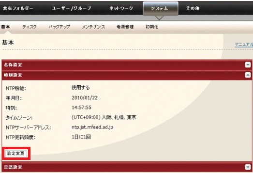 初期設定ではデフォルトのNTPサーバーを使用して、自動的に時刻を補正するよう設定されています。バックアップやスリープタイマーなど、正確な時刻で運用する必要がある場合は、NTP機能を使用することをおすすめします。