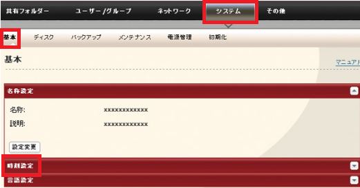 2. [システム]-[基本]-[時刻設定]をクリックします。