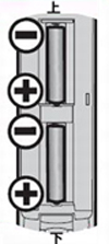 2.単四形乾電池2本を図のように[+]と[-]の向きに注意してリモコンに入れます。