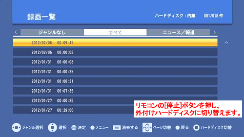 外付けハードディスクに録画した番組を消去する場合は、リモコンの[停止]ボタンを押して、外付けハードディスクに切り替えます。