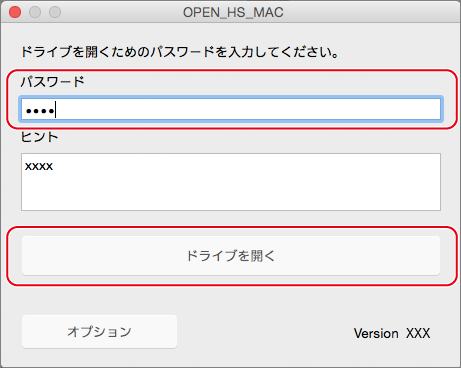 5. 認証画面が表示されます。設定したパスワードを入力し、[パスワード認証(ドライブを開く)]をクリックします。