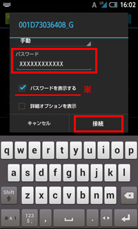 手順1で確認した暗号化キーを、[パスワード]欄にタップします。