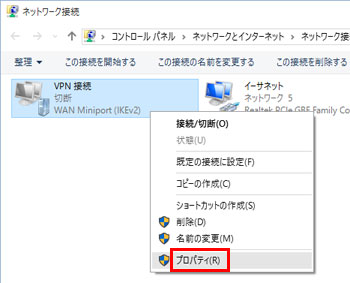 4.作成したVPN接続を右クリックして、「プロパティ(R)」をクリックします。
