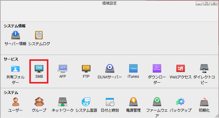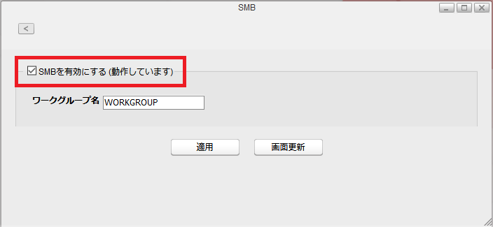 SMB設定が有効になっているか確認します。無効(または手動設定)になっている場合は「有効」(または「自動選択」)に設定してください。
