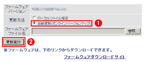 4. 「自動更新(オンラインバージョンアップ)」または、「オンラインバージョンアップ」にチェックを入れ、[更新実行] を選択します。