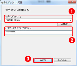 2. 暗号化ボックスの認証画面が表示されます。暗号化ボックス名を確認し、パスワードを入力し、[OK]をクリックします。
