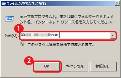 5. [ファイル名を指定して実行]の[名前]に、エアステーション設定ツールで確認したWi-Fiルーターの「\\IPアドレス/共有フォルダー名」を入力して、[OK]をクリックします。