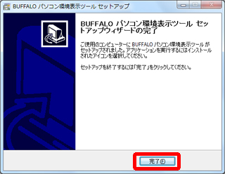 25. 「BUFFALO パソコン環境表示ツールセットアップウィザードの完了」と表示されたら、[完了]をクリックします。