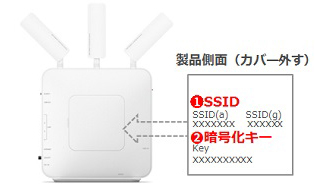 「SSID」と「暗号化キー(KEY)」は、Wi-Fiルーターの背面または下側にあるラベル、または商品添付のセットアップカードに記載されています。