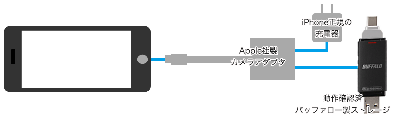 なお、ご使用の際は、必ずiPhoneの充電にお使いのLightning用充電器を併用してください。十分な電力が供給されない場合、SSDが正常に動作しない恐れがあります。