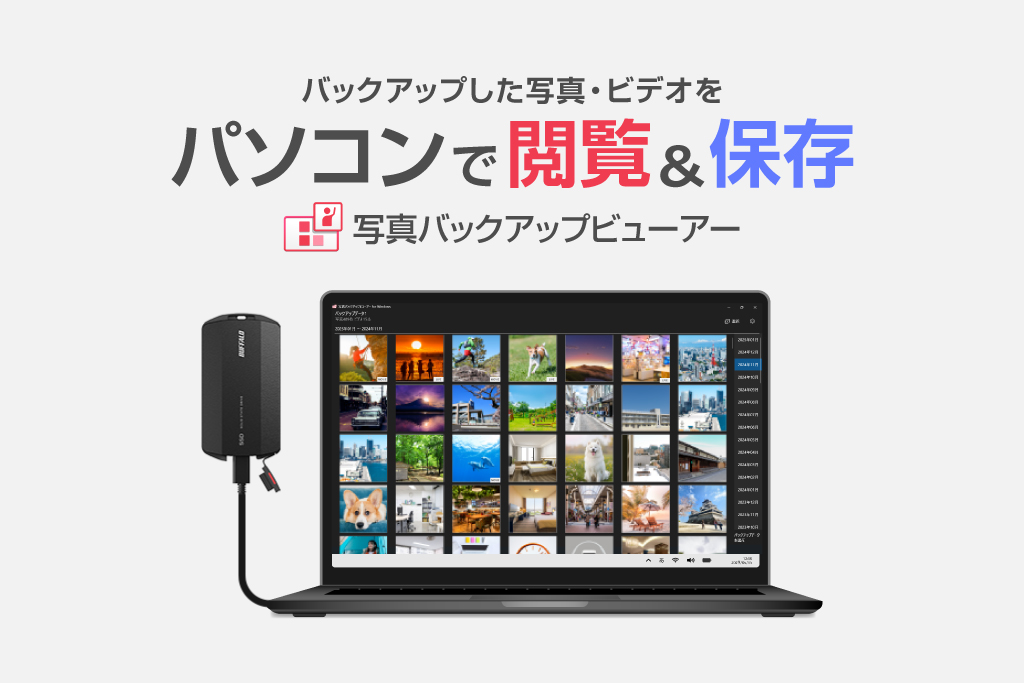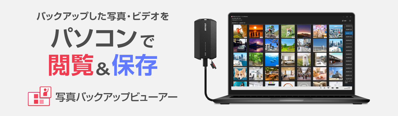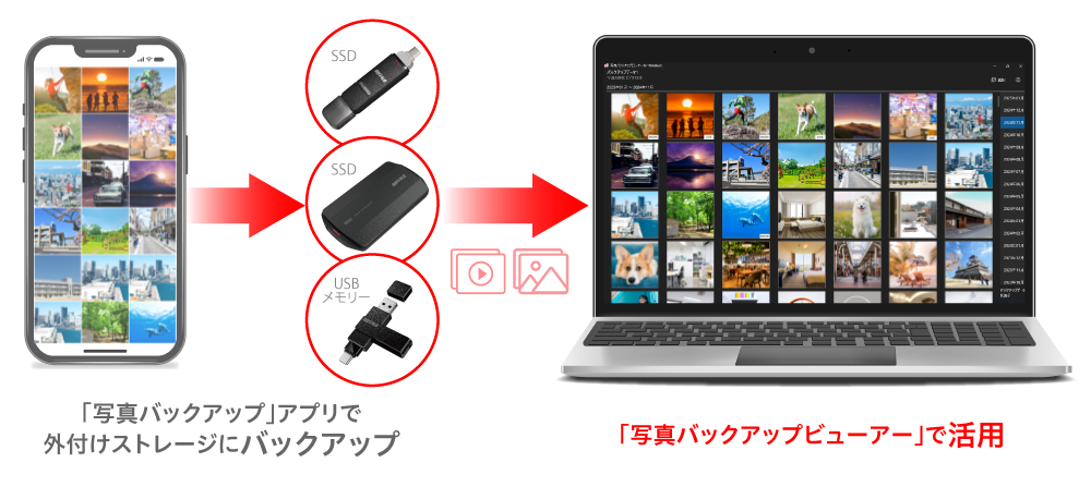 スマホの写真やビデオをかんたんに外付けストレージにバックアップできる「写真バックアップ」アプリ。バックアップしたデータはパソコン用ソフト「写真バックアップビューアー」で、もっと便利に活用することができます。
