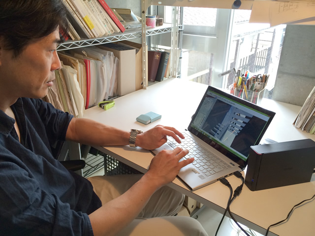仕事で使用しているパソコンはWindows搭載のノートパソコンです。ソフトがVectorWorks、AutoCAD。このふたつを使用して図面を描きます。立体のモデルを作るのがSketchUp。それとデザイナーがよく使うPhotoshopも使用します。外付けハードディスクの用途はあらゆるデータのストック、保存です。図面やパース(イメージ図)をAutoCADやSketchUpで制作して、その後Photoshopでレタッチします。建築の仕事をしていると、そういうデータがやたらとあります。数も多いし、データとしての容量も大きいものばかり。写真も多くあります。物件の工事写真や完成するまでのプロセスの写真、これも全て保管しています。写真もサイズが大きいものが多いですね。そのデータ全てがこのバッファローの外付けハードディスク「HD-GD3.0U3」に入っています。3TBと容量も大きいので、安心して入れられます。僕らの仕事は建物そのものよりも図面が命です。そのデータ自体が僕らの財産です。そういう意味では図面というのは技術的な構造を含んだ全ての調整の結果です。なので絶対に失ってはいけないもの。それをストック、バックアップしていくものが外付けハードディスクなので、我々建築家にとってもなくてはならないものであり、さらに信頼性のある自分が使いやすいブランドを選ぶのが当たり前になってきています。それが僕にとってはバッファローのハードディスクです。長い間安心して使用出来ますし、この製品は1GBのDRAMキャッシュを搭載していて書き込み速度を向上させているなど、最近のバッファローの外付けハードディスクは昔に比べてもさらに進化していっていますよね。デザインもぐっと良くなっていますしね。大切な外付けハードディスクです。