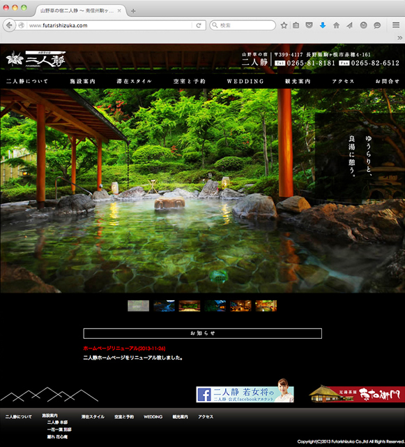「山野草の宿「二人静」。長野県・駒ヶ根高原にある和風旅館のWebサイトです。中央アルプス・南アルプスに囲まれた自然豊かなロケーション。和風でありながらもモダンな館内。そういった特徴をそのままホームページデザインに落とし込んだ、そんなイメージです。」