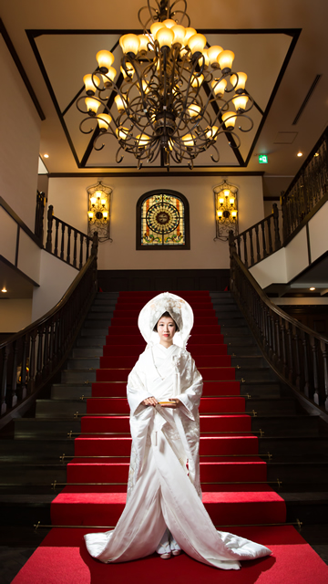 「和装が似合う大階段前にて。白無垢を着た花嫁の凜とした姿を生かすように振り付けています。」