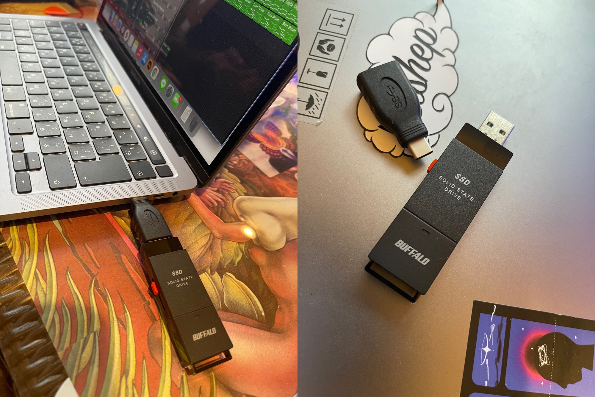 はい。僕はもともとポータブルのハードディスクをずっと使っていました。その理由としては持ち運びにも使いましたがほとんどが自宅での作業のバックアップ用として使用していました。バックアップをとるものはレコーディングをしたLogicのプロジェクトファイルが主です。楽曲の音声データ、音声ファイル、MIDIファイル、楽器を録音したデータ、その全てをレコーディング後のバックアップとしてハーディスクに保存をしていました。なのでハードディスクは活動の上で欠かせないものです。今まで使っていたものは容量が750GBのポータブルハードディスクでした。でもSSDが欲しかったんです。今のSSDは自分が持っているポータブルのハードディスクよりも小さい上に容量も大きい。なので使っていたポータブルのものよりもサイズが小さく大きい容量のSSDを探していたんです。そこで目を付けたたのがバッファローのスティック型SSD「SSD-SCT1.0U3-BA」でした。