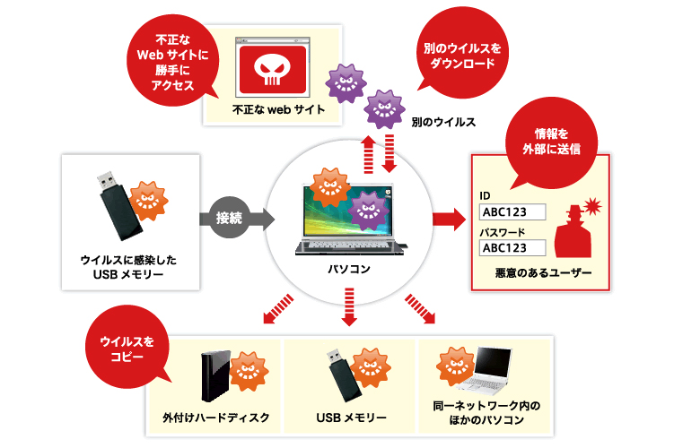 USBウイルスは感染後、インターネット上から別のウイルスをダウンロードし、複数のウイルスと連携して以下の活動を行ないます。